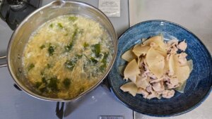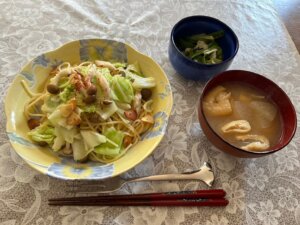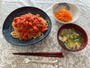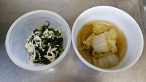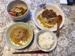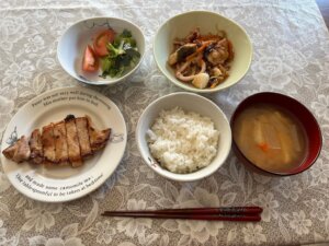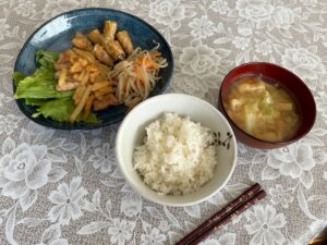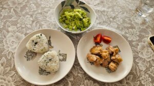 昼食→炊飯4合、ワカメおむすび、味噌汁(カボチャ玉ねぎ)、照り焼きチキン、キャベツナムル、トマト