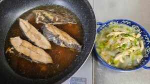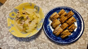 夕食→カレイ煮付け、白菜高野豆腐干しエビ煮浸し、お昼の残り